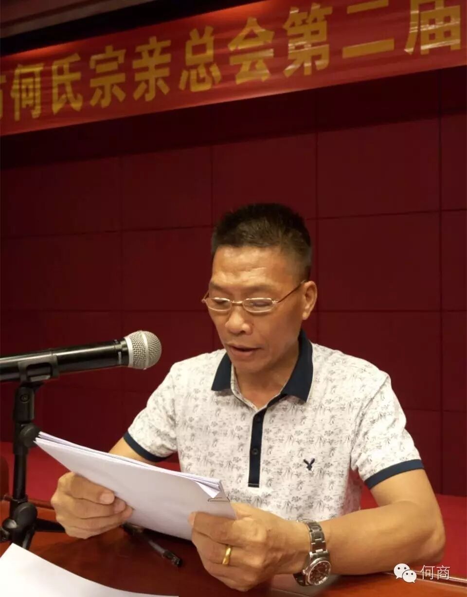 在会议上,常务副总会长何忠和宣读了第二届理事会组成名单和班子成员工作分工。何金泉任总会长,何添文任监事长,何结林、何忠和、何冠开任常务副总会长。理事会常务委员会由何金泉、何添文、何结林、何忠和、何冠开、何红莲组成,并从即日起履职。上图:常务副总会长何忠和宣读理事会班子名单和工作分工。