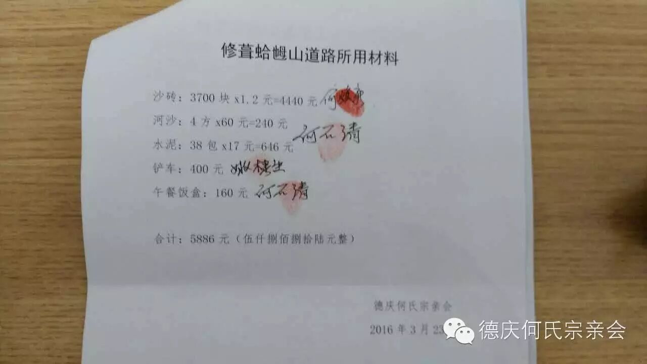 自 2016年3月5日,由德庆何氏宗亲会牵头倡议,高良石头蛤乸山严氏太婆祖墓道路修葺工程现已基本完成。期间得到广大宗亲的大力支持,慷慨解囊,捐资捐物。德庆何氏宗亲会衷心感谢广大宗亲的支持和配合,特别感谢将修路人工都捐献出来的高良石头何氏兄弟,为何氏谋福荫。现将各项收支公布如下: